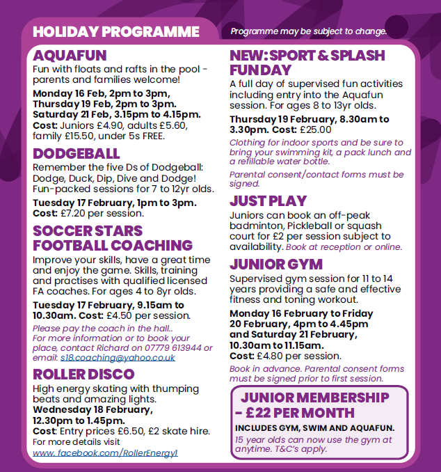 Sessions are planned for each weekday of February half term and run subject to sufficient bookings.